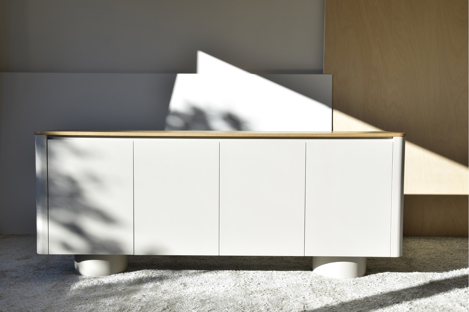 APARADOR REALIZADO EN DM LACADO EN TONO GRIS ARENA CON ACABADO MATE Y PARTE SUPERIOR RECHAPADA EN MADERA DE ROBLE NATURAL. PIEZA DE MOBILIARIO DE LINEAS SUAVES Y SINUOSAS CON BORDES REDONDEADOS Y DISEÑO ATEMPORAL EN EL QUE DESTACA LA ORIGINALIDAD DE SU BASE FORMADA POR DOS CILINDROS LACADOS A MODO DE PATAS. LA COMBINACIÓN DEL LACADO MATE CON LA MADERA DE ROBLE APORTA CALIDEZ A ESTE PIEZA. EL CUERPO PRINCIPAL ESTÁ FORMADO POR 4 PUERTAS CON APERTURA SUAVE CON ESTANTE DE VIDRIO TEMPLADO EN EL INTERIOR.