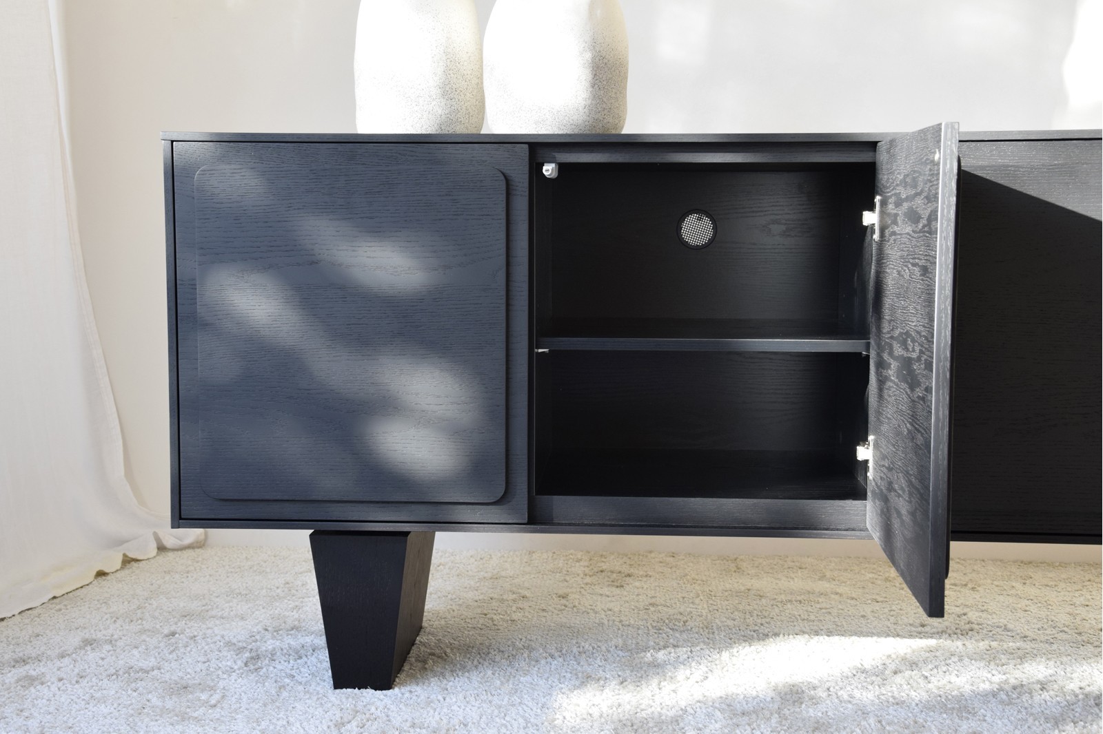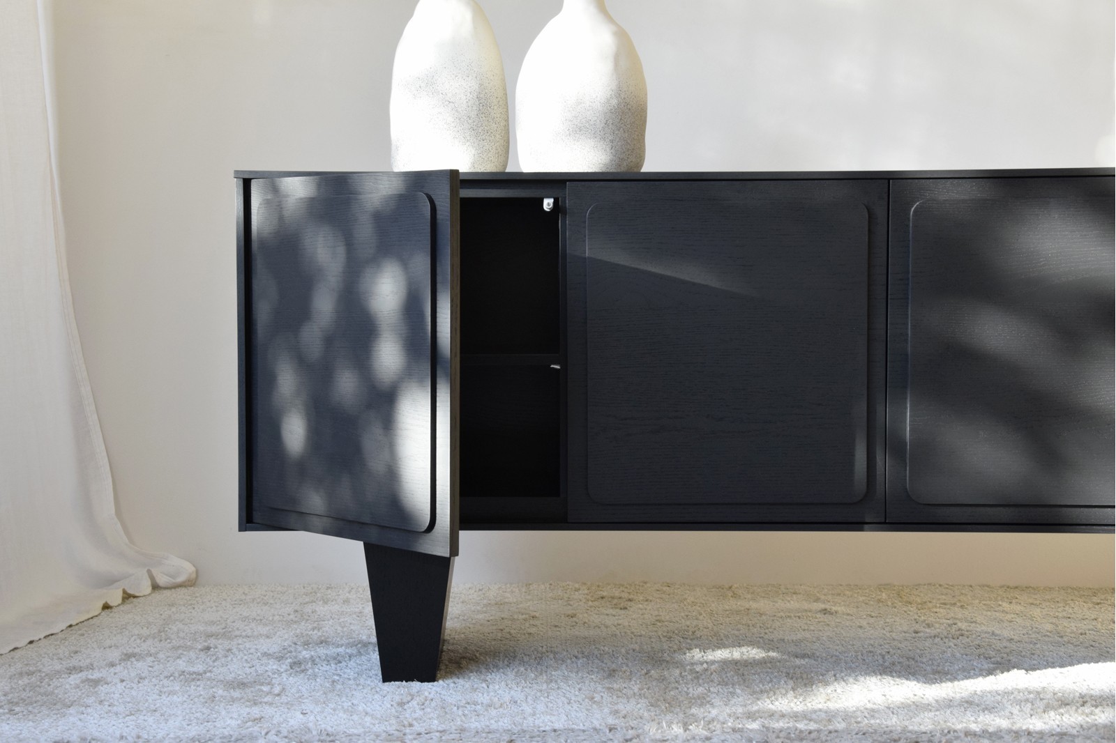 APARADOR RÍO. APARADOR REALIZADO EN DM RECHAPADO EN ROBLE NATURAL TEÑIDO EN COLOR NEGRO DE ACABADO MATE. CUENTA CON 4 PUERTAS CON SISTEMA PUSH DE APERTURA Y ESTANTES INTERIORES. LIMPIAR CON UN PAÑO SECO. NO UTILIZAR PRODUCTOS ABRASIVOS. REQUIERE MONTAJE.