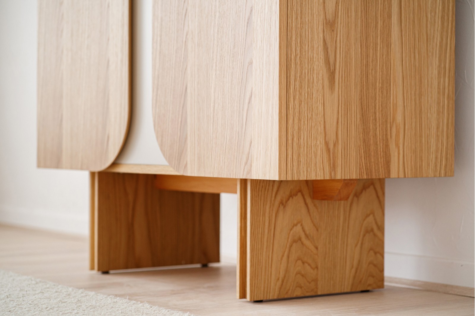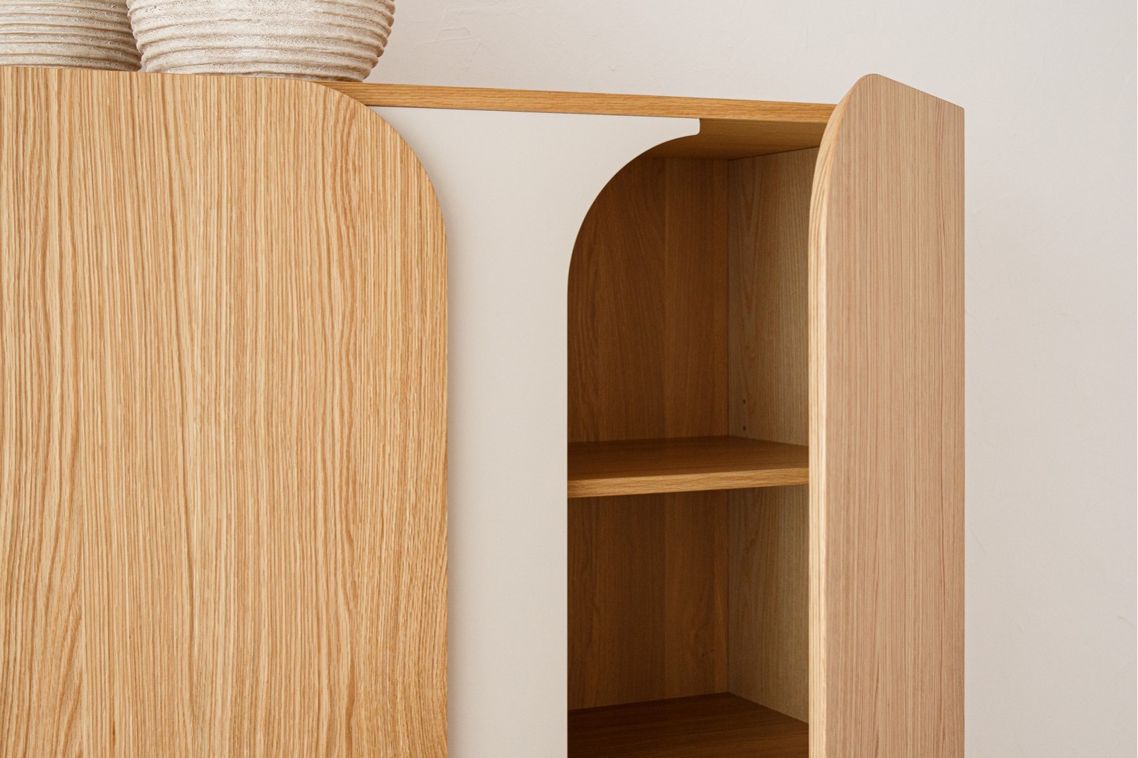 ARMARIO COLECCIÓN CURVA. ARMARIO REALIZADO EN TABLERO DE DM RECHAPADO EN ROBLE NATURAL ACABADO MATE. DETALLE CENTRAL EN LACA TONO GRIS ARENA MATE. CUENTA CON TRES ESTANTES INTERIORES. LA COMBINACIÓN DE TONOS Y TEXTURAS CREA UN DISEÑO LIMPIO Y SERENO EN EL QUE DESTACAN DETALLES COMO LA LÍNEA CURVA DE LAS PUERTAS Y EL PERFIL DE LA PATA QUE HACEN DE ESTE MUEBLE LA PIEZA PERFECTA PARA DEFINIR UN ESPACIO. LIMPIAR CON UN PANO SECO. NO UTILIZAR PRODUCTOS ABRASIVOS. REQUIERE MONTAJE