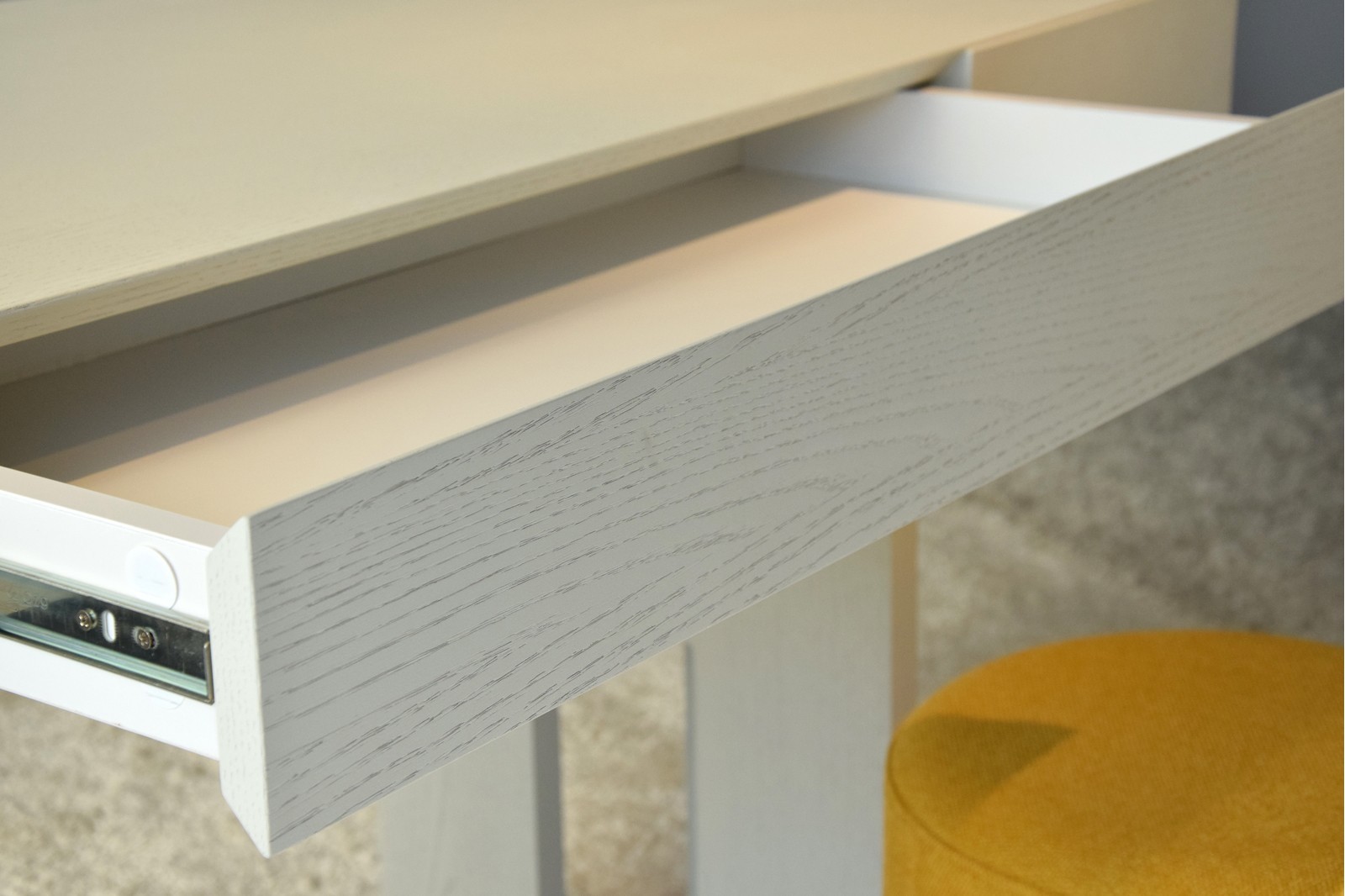 ESCRITORIO DE FORMAS ESCULTÓRICAS REALIZADO EN DM RECHAPADO EN MADERA ROBLE NATURAL TENIDO EN UN TONO BLANCO ROTO MATE QUE DEJA A LA VISTA LA VETA NATURAL DE LA MADERA. CUENTA CON UN PRÁCTICO CAJÓN CENTRAL.