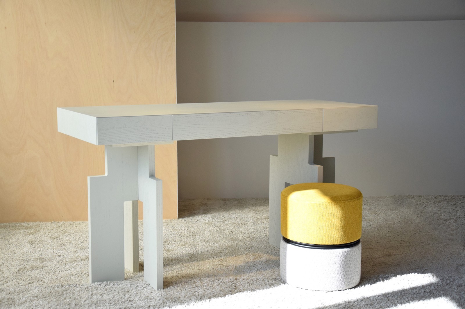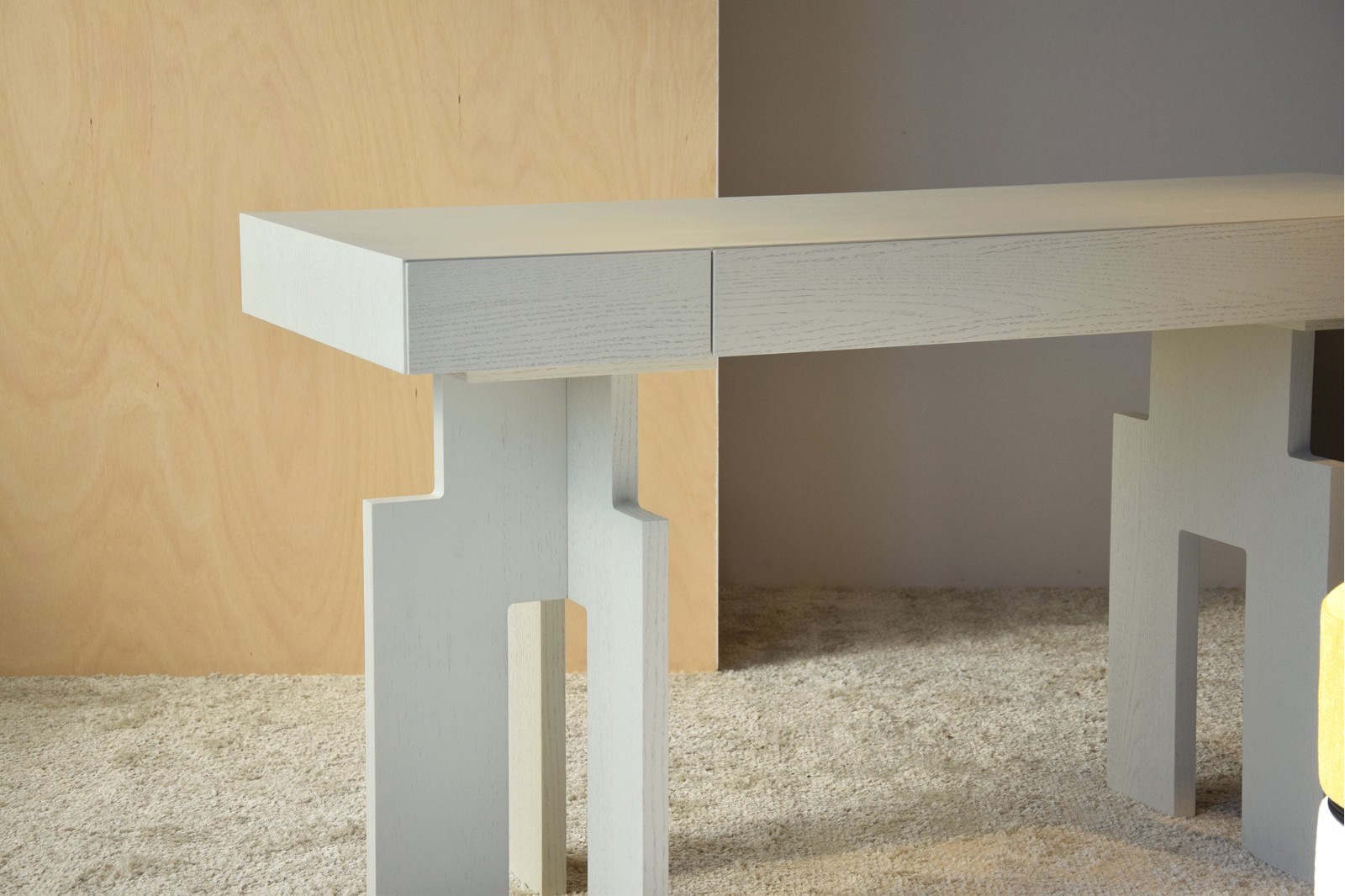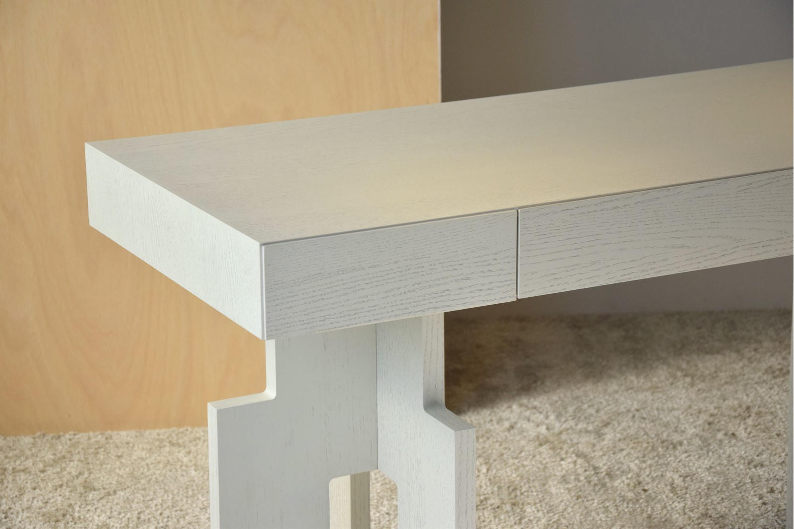 ESCRITORIO DE FORMAS ESCULTÓRICAS REALIZADO EN DM RECHAPADO EN MADERA ROBLE NATURAL TENIDO EN UN TONO BLANCO ROTO MATE QUE DEJA A LA VISTA LA VETA NATURAL DE LA MADERA.