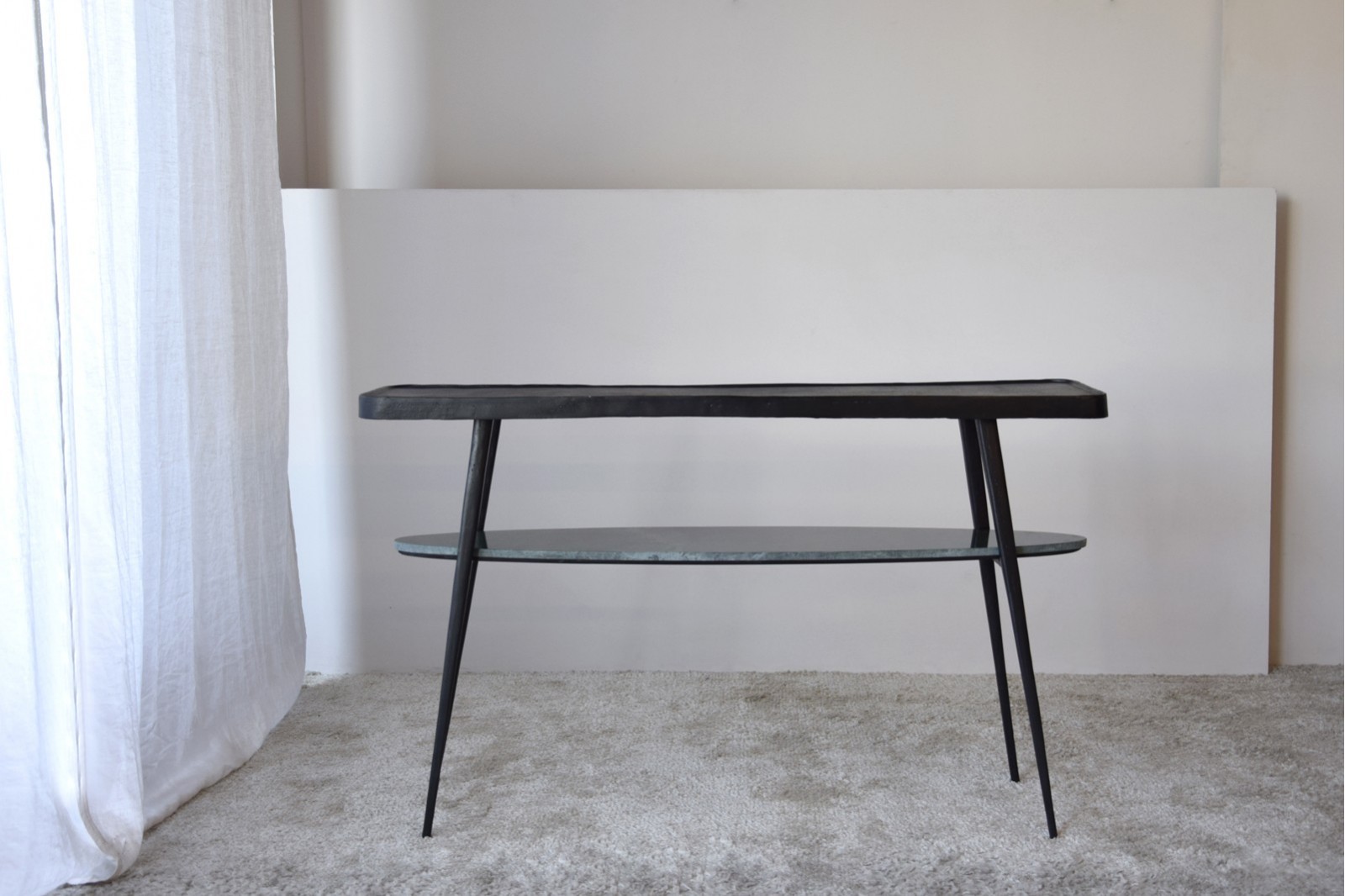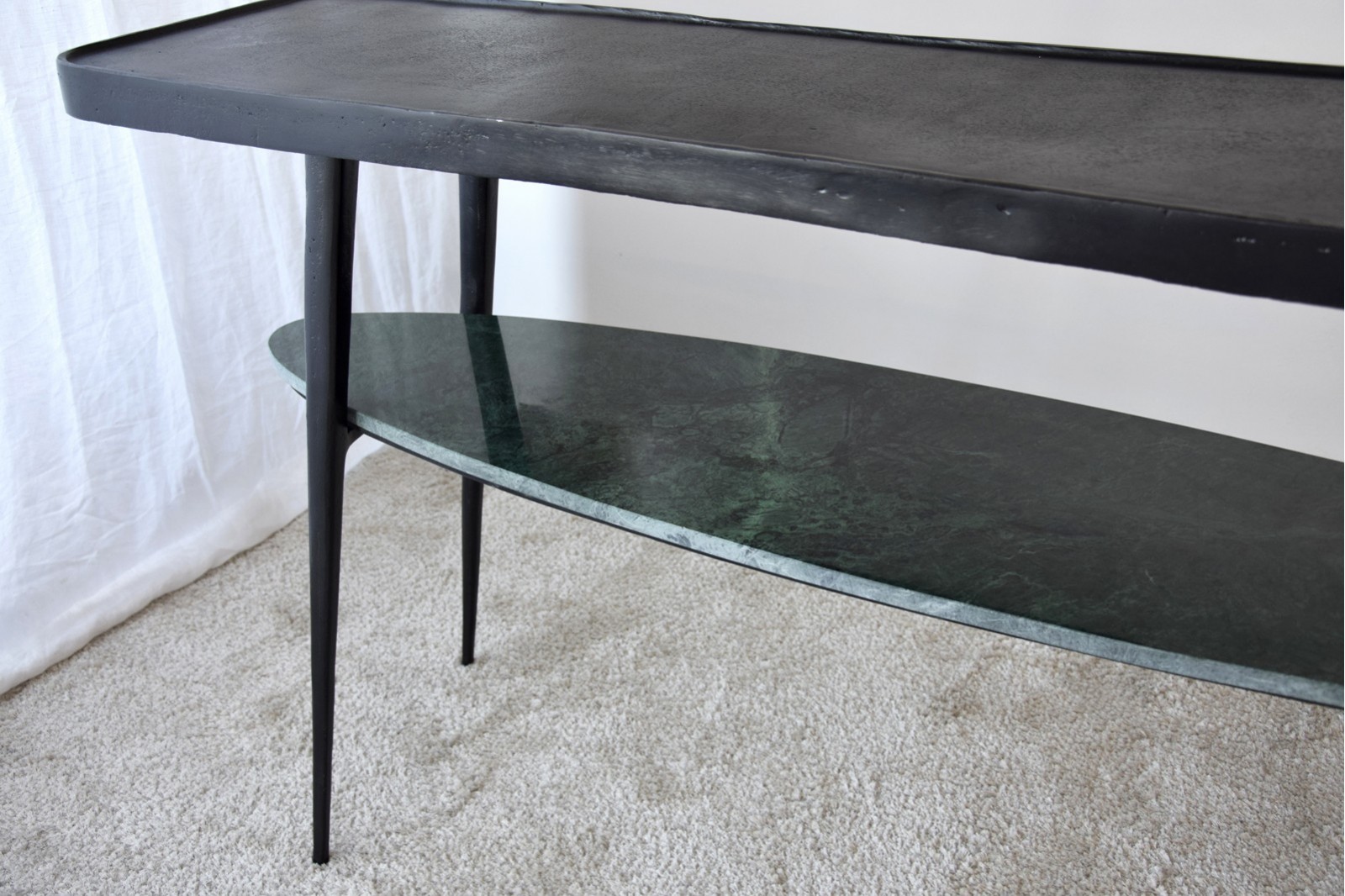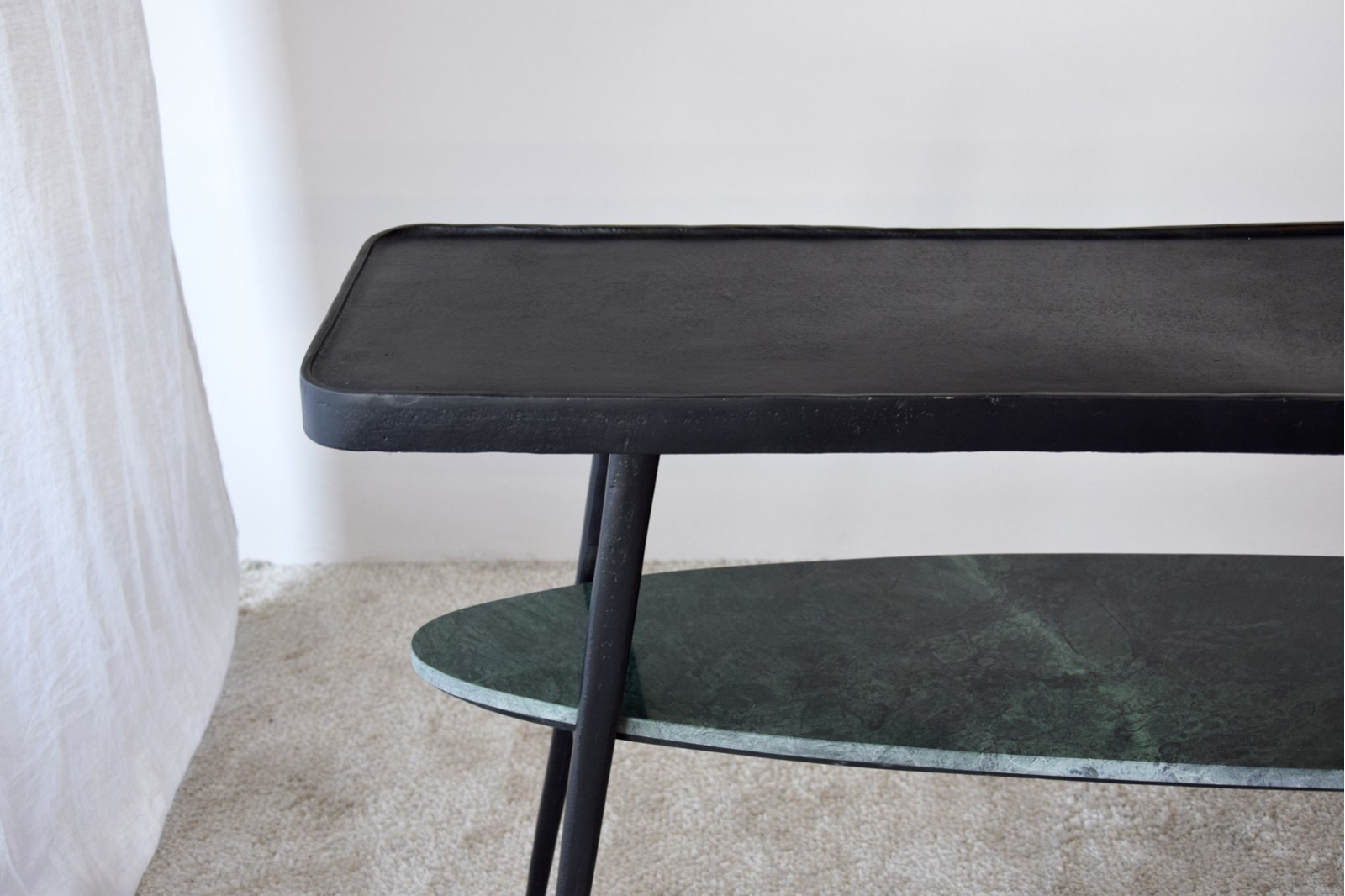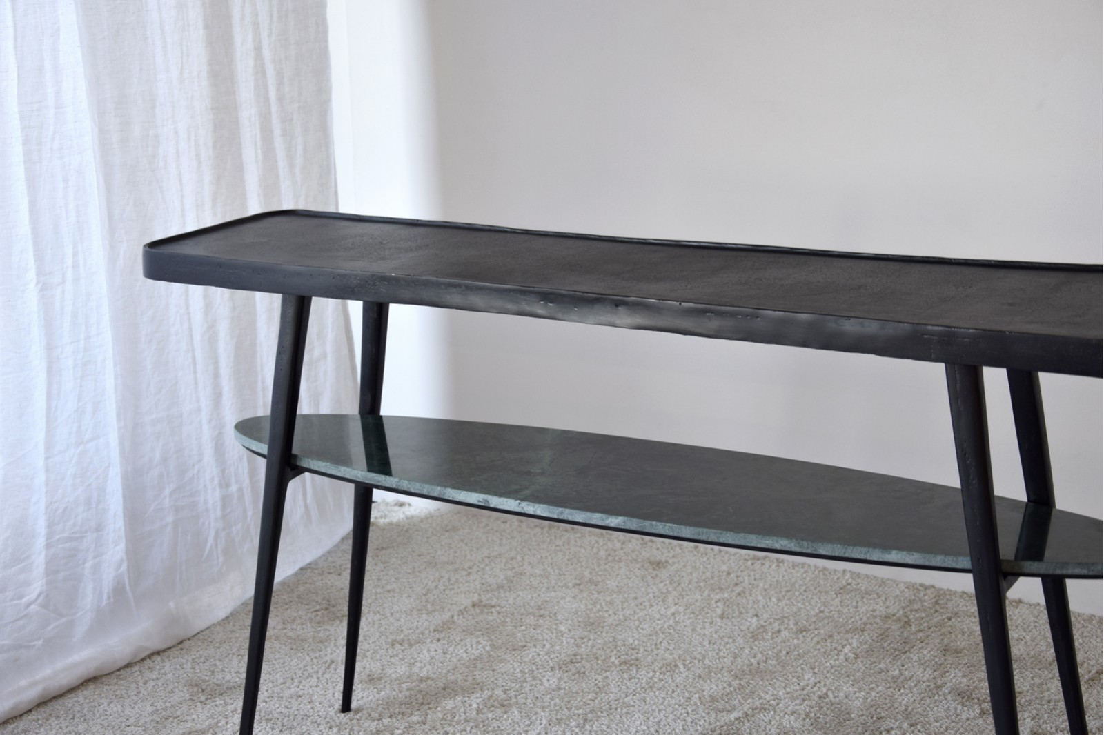 CONSOLA EN ALUMINIO Y MÁRMOL. ESTA PIEZA ESTÁ PENSADA PARA SUBIR EL VALOR DECORATIVO DEL ESPACIO CON SU ESTRUCTURA REALIZADA EN ALUMINIO COLOR NEGRO Y UNA PIEZA OVAL A MODO DE ESTANTE EN MÁRMOL NATURAL DE COLOR VERDE QUE LA DOTA DE PERSONALIDAD Y COLOR.