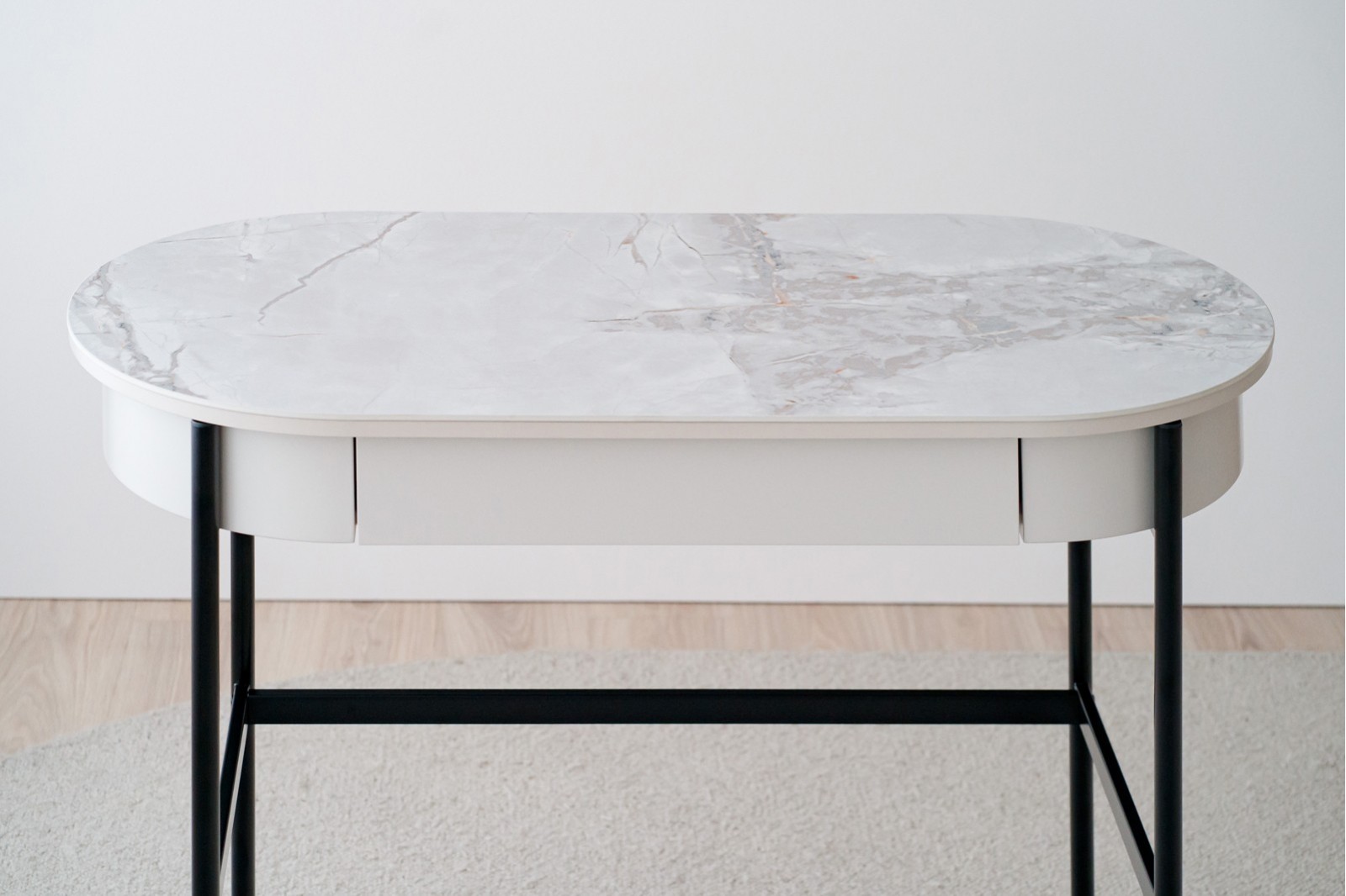 ESCRITORIO N.26. DE DISEÑO OVAL. ESTE ESCRITORIO ESTÁ REALIZADO EN TABLERO DM LACADO EN UN TONO GRIS ARENA DE ACABADO MATE QUE COMBINA A LA PERFECCIÓN CON LOS TONOS BLANCOS GRISES Y OCRES DEL CERÁMICO ESCOGIDO PARA EL TABLERO. CUENTA CON UN PRÁCTICO CAJÓN Y LA ESTRUCTURA ESTÁ REALIZADA EN METAL DE COLOR NEGRO Y ACABADO MATE. REQUIERE MONTAJE. LIMPIAR CON PAÑO SECO.
