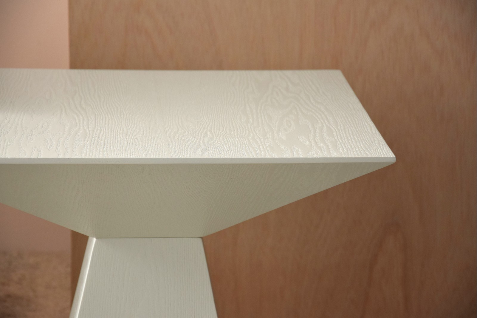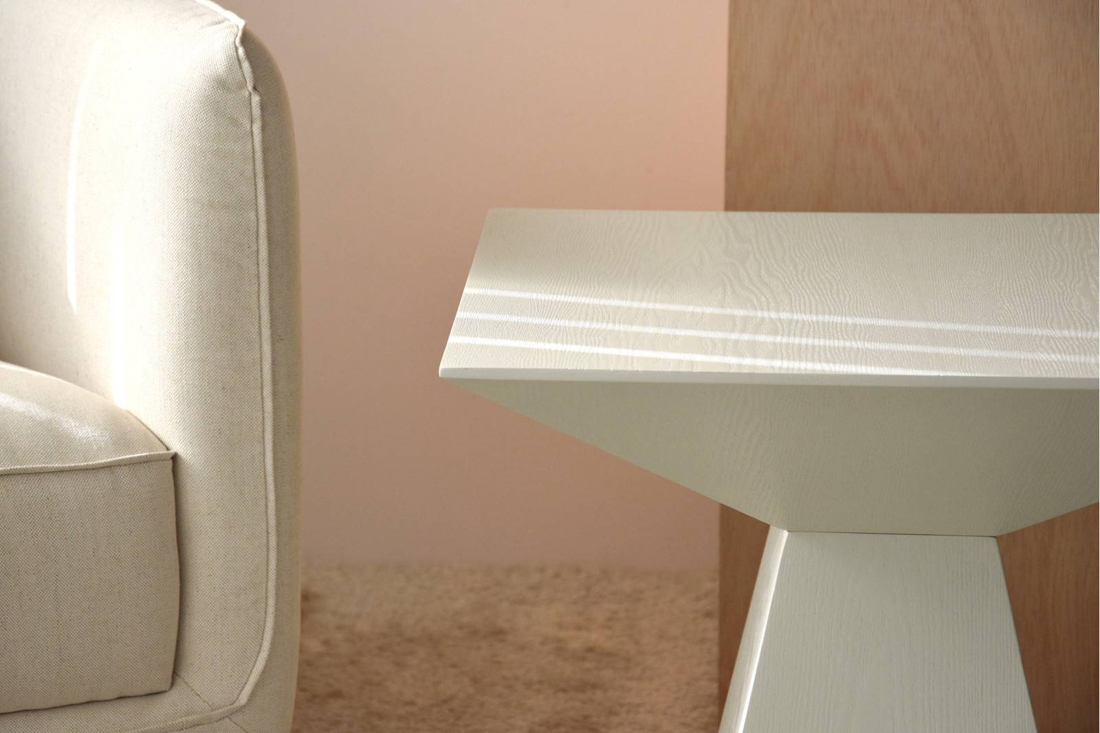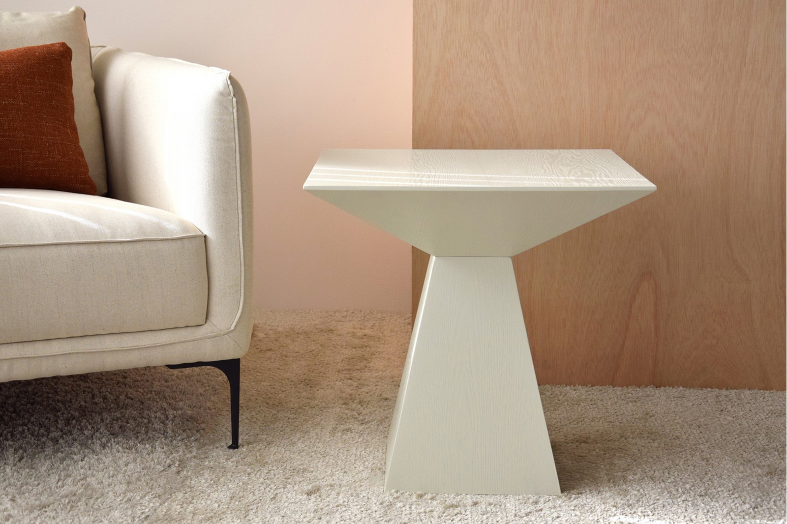 MESA AUXILIAR CUADRADA REALIZADA EN TABLERO DE DM RECHAPADO EN MADERA DE FRESNO NATURAL TEÑIDO EN UN TONO BLANCO ROTO MATE QUE DEJA A LA VISTA LA VETA NATURAL DE LA MADERA.