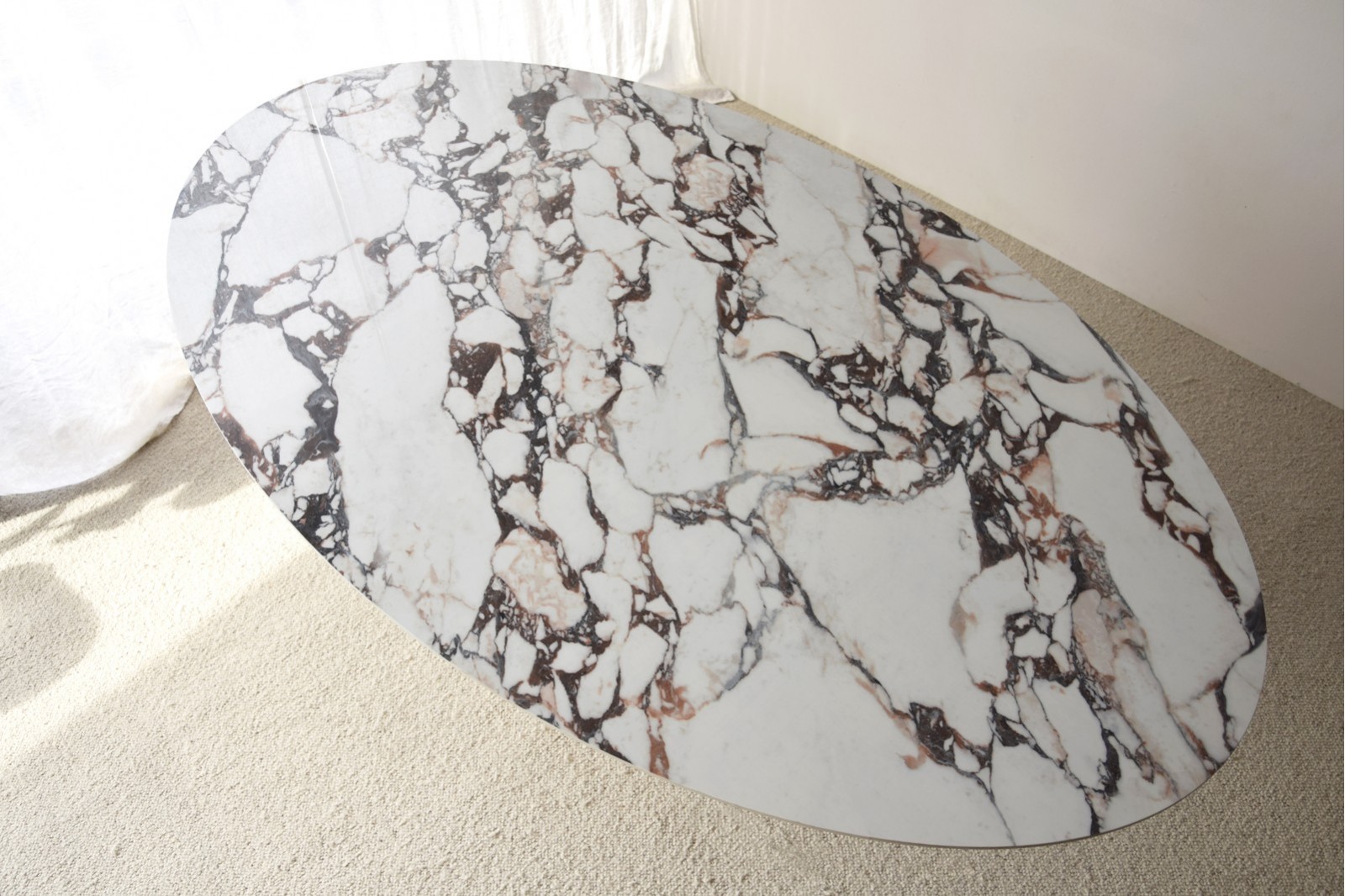 MESA COMEDOR OVAL CON PARTE SUPERIOR EN MATERIAL CERÁMICO ACABADO MÁRMOL CON UN DIBUJO EN DISTINTAS TONALIDADES MARRÓN VIOLETA ROJO SOBRE FONDO BLANCO ACABADO BRILLO.